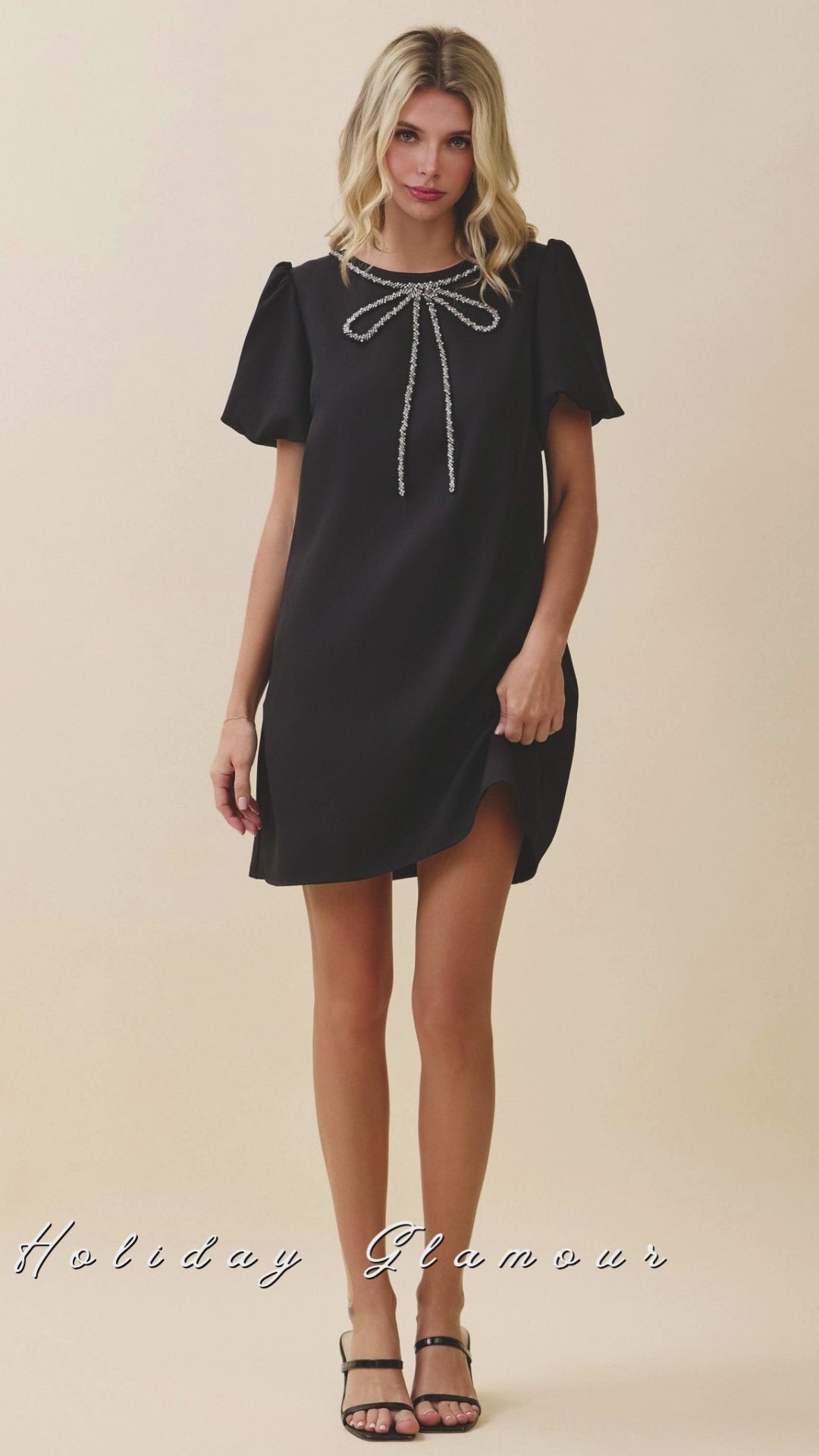 Sparkling Crystal Bow Trim A Line Mini Dress